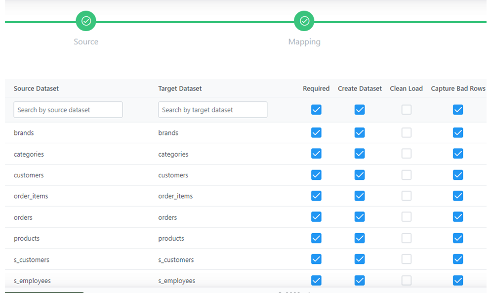 Connectors Auto Schema Mapper Wizard Multiple Target Migration List of Tables Full Refresh Bad Rows Capture Incremental Load Filters Upload Mapping Config